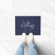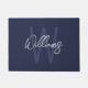 This design features personalised name in white modern handwriting script font style and monogram in light navy blue modern sans serif font style as background, on navy blue background.