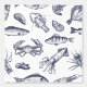 Nautical navy blue peel-and-stick removable vinyl wallpaper for a wall kitchen decor with a seamless seafood sketch illustration pattern with fish, lobsters, crabs, shrimp, squid, and more.