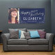 Editable sixtieth birthday party banner featuring a stylish navy blue background that can be changed to any colour, a photo of the birthday boy/girl, silver sparkly glitter, the words "happy 60th birthday" in a faux silver foil script, their name, and the date.