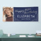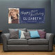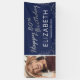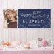 Trendy eightieth birthday party banner featuring a stylish navy blue background that can be changed to any colour, a photo of the birthday boy/girl, elegant silver glitter, the words "happy 80th birthday" in a faux silver foil script, their name, and the date.