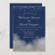 An elegant navy blue and silver wedding invitation featuring silver confetti dust at the top and blingy silver accent at the bottom.