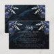 This elegant wedding details enclosure card features navy blue floral bouquets set off with silver faux foil greenery in two corners, on a background image of navy blue watercolor agate. The customisable text combines silver grey serif, italic and handwriting fonts. The reverse side features a matching navy blue and silver floral and agate design.