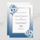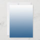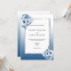 On front: Navy blue and white gradient ombre background with a faux silver frame. Decorated with watercolored flowers, florals in shades of blue. Templates for the bride and groom's names and party details. The text is written with black coloured letters.