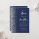 The left-hand edge of this elegant modern wedding invitation features a silver faux glitter border. The customisable text combines pale silver grey script and sans serif fonts on a navy blue background. The reverse side features a matching navy blue and silver design.