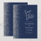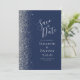 The left-hand edge of this elegant modern wedding save the date card features a silver faux glitter border. The customisable text combines silver grey handwriting, copperplate and italic fonts on a navy blue background. The reverse side features a matching navy blue and silver design.