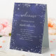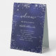 A navy blue background, decorated with faux silver glitter sparkles. The blue colour is uneven. Personalise and add your names and the wedding program.