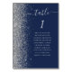 The left-hand edge of this elegant modern wedding table number card features a silver faux glitter border. The word "table" appears in silver grey whimsical handwriting script on a navy blue background. Add the names of your guests who are assigned to each table.