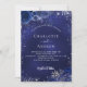 A navy blue background, decorated with faux silver glitter, sparkles and blue florals. The blue colour is uneven. Personalise and add your names and details.