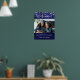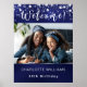 A photo birthday party welcome poster. Personalise and add a name and age. Navy blue background, white text. The blue colour is uneven. Decorated with faux silver stars.