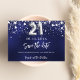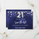 A modern and elegant Save the Date for a 21st birthday party. A navy blue background decorated with faux silver stars. Personalise and add a date and name. The blue colour is uneven. The text: Save the Date is written with a large trendy hand lettered style script.