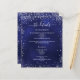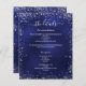 A modern, elegant wedding program/details/timeline. A navy blue coloured background decorated with faux silver glitter sparkles. The blue colour is uneven. Personalise and add your names and wedding details. White coloured letters.