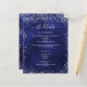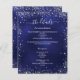 A modern, elegant wedding program/details/timeline. A navy blue coloured background decorated with faux silver glitter sparkles. The blue colour is uneven. Personalise and add your names and wedding details. White coloured letters.