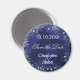 A Save the Date magnet for your wedding guests. A navy blue background, white text. The blue colour is uneven. Decorated with faux silver sparkles. Personalise and add your names and wedding date.