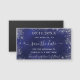 A trendy wedding Save the Date magnet. A trendy navy blue background. The blue colour is uneven. Decorated with faux silver glitter sparkles. Personalise and add a date, place and your names. Save the Date is written with a modern hand lettered style script with swashes.