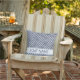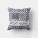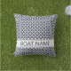Navy Blue and White small geometric pattern accent pillow for outside seating areas. Boat pillow with Japanese SHIPPO pattern and modern minimal Boat Name typography. Boat name placement double-sided. This Custom Boat Name pillow is a powerful decor idea for elegant outside seating areas, and a great gift idea for boaters and sailors. Patio deck decorating ideas made with ocean love © y.BEE SEA