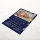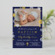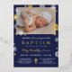 Gold foil boy baptism invitation in navy blue, white, and gold foil with a photo of your son. Navy blue, white, and gold winter baptism invitation personalised with a photo of your baby boy and a golden cross.