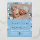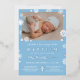 Silver foil boy baptism invitation in light blue, white, and gold foil with a photo of your son. Blue, white, and silver winter baptism invitation personalised with a photo of your baby boy and a silver cross and pretty snowflakes.