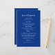 Navy blue wedding menu with white wording. Customise many sections and lines of text on this affordable flat card. Script font is used for names of the bride and groom at the top, and for the section headings. Each section of text can include 2 or 3 lines, and entrée number can be two or three. Also, include date and location of event at the top. Navy blue colour on both sides.