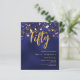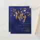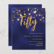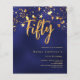 A modern, stylish invitation for a 50th birthday party for both him and her. Decorated with golden stars. Navy blue background and the word Fifty written with large faux gold letters. The blue colour is uneven. Personalise and add a name and party details.