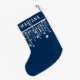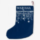 Navy blue and white string lights sparkles Christmas stocking with a cute whimsical fun lights and name for a festive Holiday season.
