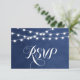 Chic modern summer wedding RSVP reply card design with simple elegant glowing string lights hanging across the top and a classy mix of modern and calligraphy script fonts on a printed faux watercolor texture background. A simple and stylish preppy design, perfect for summer! Click the CUSTOMIZE IT button to customise fonts, move text around and create your own unique one-of-a-kind invitation design.