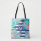 This unique and pretty tote bag features a beautiful teal green, gold, pink and white seashell pattern laid over and under a navy blue stripe background. At the centre is your monogram in white and placed on a semi-transparent navy blue circle banner. The back of the bag has the same seashell pattern, but without the banner or monogram.