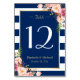 Navy Blue Stripes Floral Wedding Table Number Card.