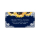 Rustic navy blue floral wedding address labels featuring sunflowers, string lights and delicate floral lace against a burlap background.