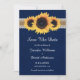 Custom rustic navy blue and sunflower wedding save the date card featuring sunflowers against a vintage burlap and lace background adorned with string lights.