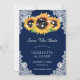 Navy blue rustic floral wedding save the date cards featuring sunflowers on a burlap background adorned with white floral lace and string lights. Matching items available.