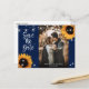 Rustic floral save the date photo postcards featuring sunflowers and string lights on a burlap background. Ideal card design for a navy blue rustic wedding party inspired by sunflowers.