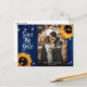 Rustic floral save the date photo postcards featuring sunflowers and string lights on a barn wood background. Ideal card design for a navy blue rustic wedding party inspired by sunflowers.