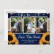 These navy blue rustic wedding save the date photo postcards featuring burlap, lace and barn wood background with sunflowers are ideal for a navy blue rustic wedding party inspired by sunflowers.