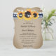 Rustic navy blue and sunflower wedding invitation featuring sunflowers and string lights against a vintage burlap background adorned with burlap and lace navy blue ribbon. Two burlap hearts at the back. Easily personalise this navy blue wedding card with your wedding details.