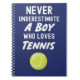 Keywords: Navy blue tennis gifts for boys kids players lover notebook, Never underestimate a boy who loves tennis, Halloween, Thanksgiving, Christmas, Xmas, ornament, presents, themed, unique, gag, related, lover, stocking stuffer, novelty items, joke, humour, birthday, for him, boys, cute, son, grandson, kids, back to school, quote, young athlete gift.