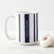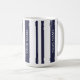 Navy blue vertical stripes with your name personalised mug. Set of three navy blue striped panels with white text name field at centre stripe on a white background.
