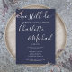 Featuring signature style names, this elegant navy blue vow renewal anniversary invitation can be personalised with your details in chic black typography. Designed by Thisisnotme©