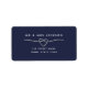 Simple, minimal, modern calligraphy navy blue wedding return address label with silver rope heart.