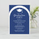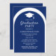 Navy blue and white arch and graduation cap graduation party invitation for the class of 2024 or any year. Text is customisable, so make it your own. Contact me for assistance with customisation or to request matching products.