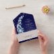 Navy blue and white floral crescent moon garland with hearts wedding All in One Invitation. The focus of this all n one wedding invitation is the beautiful white garland. There is also gold confetti on the edges. The RSVP is detachable.