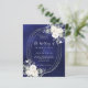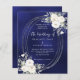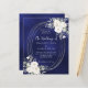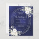 A blue, uneven coloured background. An oval faux silver frame decorated with watercolored white florals, roses. Personalise and add your names, details. White text.