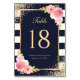 Elegant navy blue and white striped floral table number card featuring watercolor blush pink flowers and gilded greenery. Matching items available.