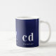 A navy blue background. The blue colour is uneven. Personalise and add a name and monogram initials (x3). The name is written in white with modern block letters.