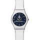 Add a name or text to this bright, fresh and modern nautical maritime anchor in bright white, on a dark navy blue with some plank wood-look background. A nice gift for the sailor or boat enthusiast.