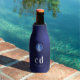 A navy blue background. The blue colour is uneven. Decorated with a ship anchor and steering wheel. Personalise and add a name and monogram initials. The name is written in white with modern block letters.