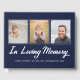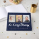 Memorial service guest book in navy blue printed with three photos of your loved one. Personalise by writing their name and years living. In loving memory is written in a handsome white font.