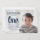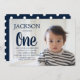 Navy blue and white polka dot child's 1st birthday party invitation.