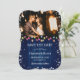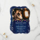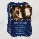Navy blue holiday wedding photo save the date featuring Christmas lights and snowflakes on a rustic wood background. Easily personalise this winter save the date with your photo and wedding details.