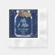 Rustic navy blue wedding paper napkins featuring a mason jar and burlap hearts on a barn wood background.