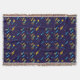 Navy blue woven blanket with a colorful pattern of pencils and rulers in yellow, blue, and red. Displayed in horizontal and vertical orientations.